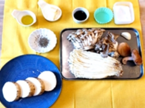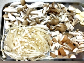 きのこ類は石づきを取りえのきは半分に、しめじと舞茸は手で割いておく。しいたけは軸をとり手で割く。