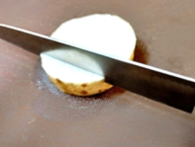 長芋の片面に縦横にかくし包丁を細かく入れ、両面に塩こしょうをふる。