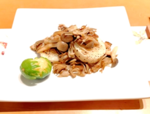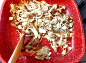 ②のフライパンににんにく薄切りを入れ弱火で炒め、香りが出たらきのこ類を入れ炒める。酒を入れひと煮立ちさせてから、塩少々で味を調え、最後にしょうゆを回しかける。