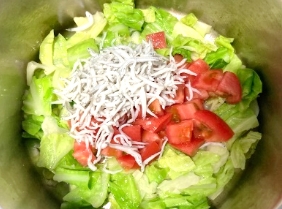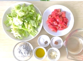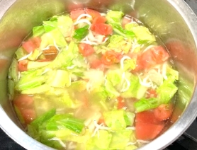 鍋にオリーブ油とニンニクを入れて熱し、香りが立ってきたらキャベツを炒め、しらすとトマトを加える。