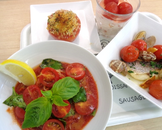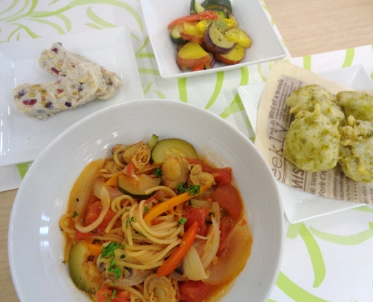 グルテンフリー&豆の活用ということで「豆100%パスタ」や「豆乳ヨーグルトのデザート」を紹介し、夏野菜をたっぷり使い好評でした。夏野菜は色鮮やかなので、華やかで笑顔いっぱいのレッスンとなりました。【生徒さんの声】