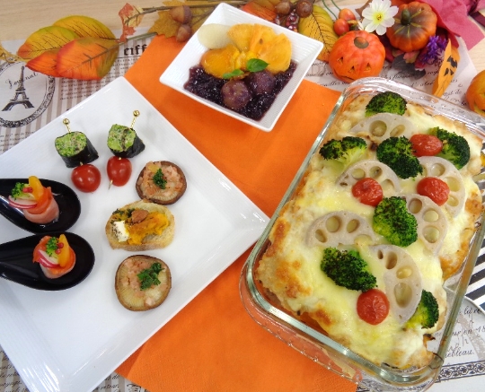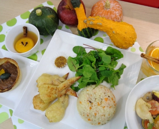 横浜の秋野菜でアメリカ旅行気分を満喫して頂きました♪ハロウィン、サンクスギビング、クリスマスに定番のターキーはミニローストチキンで、スパイスの効いたパンプキンパイやアップルサイダーはお好みのスパイスで仕上げて「簡単に出来ておいしい」と好評でした。【生徒さんの声】
