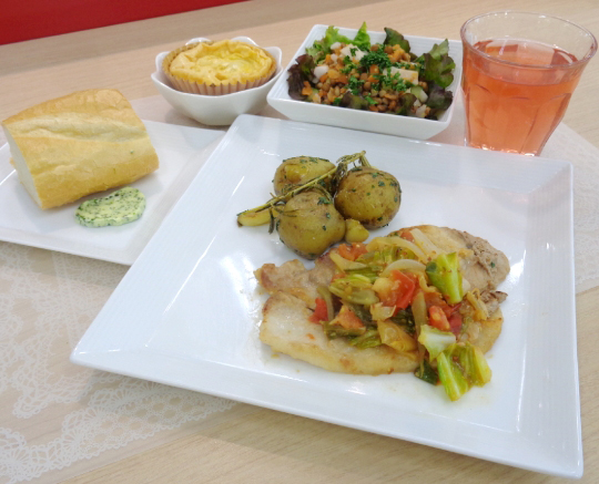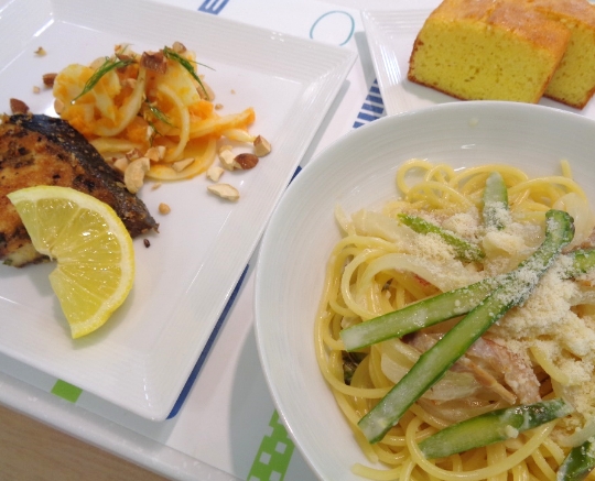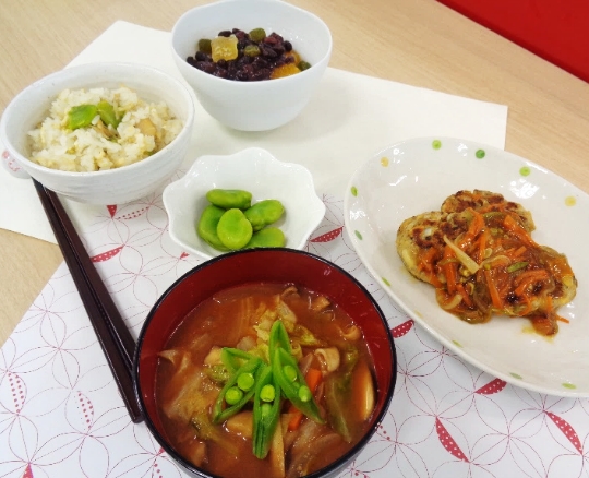 災害時にも使えるストックの缶詰に、空豆、新玉ねぎ、じゃがいも、スナップえんどうなど、横浜野菜たっぷりのバランス献立が、あっという間に仕上がり、「どれも簡単で美味しい」「うちでも作りたい」と好評でした。【生徒さんの声】